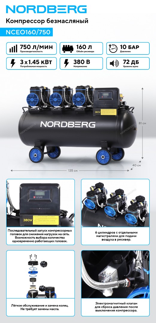 Компрессор безмасляный 380 В, ресивер 160 л, 750 л/мин Nordberg NCEO160/750 характеристики