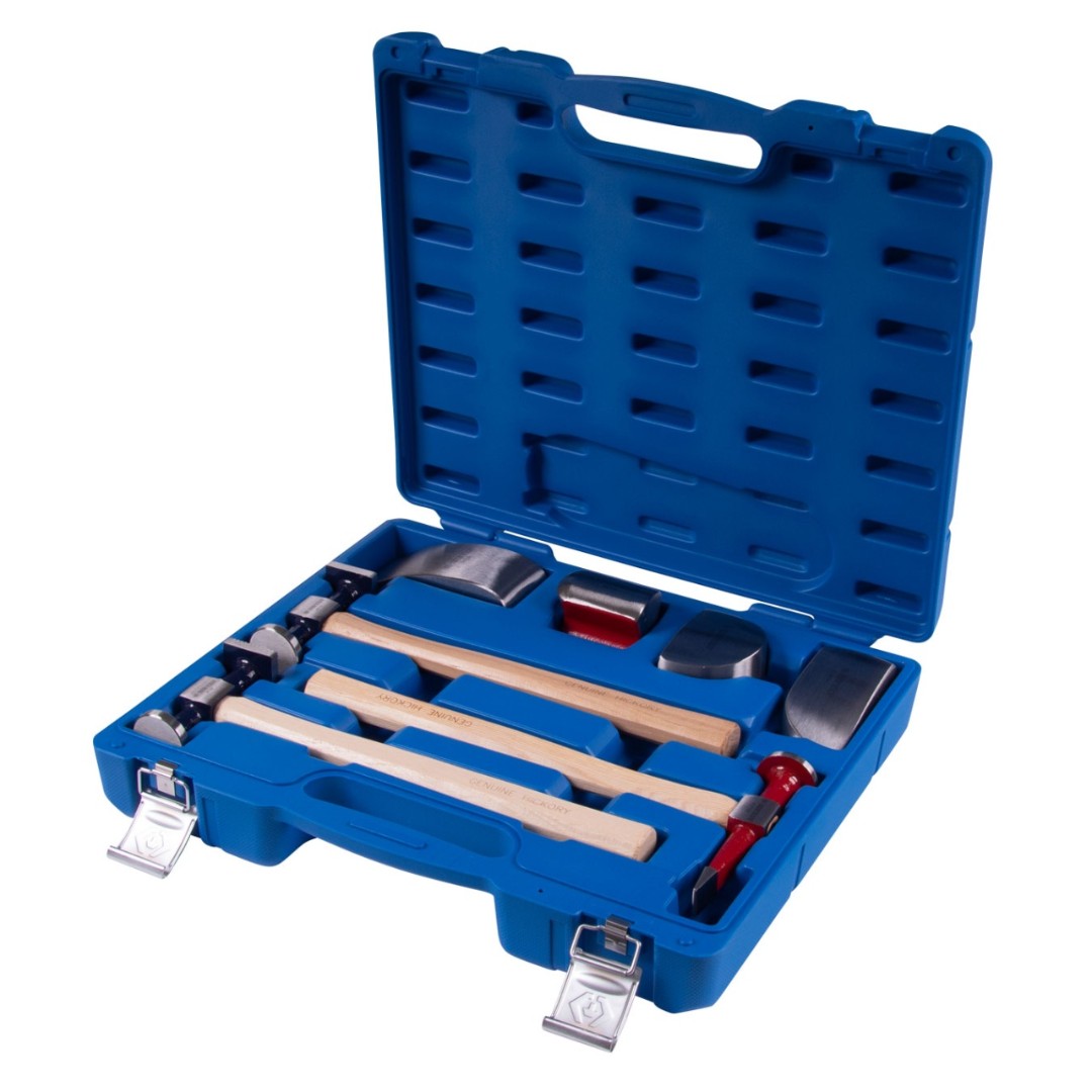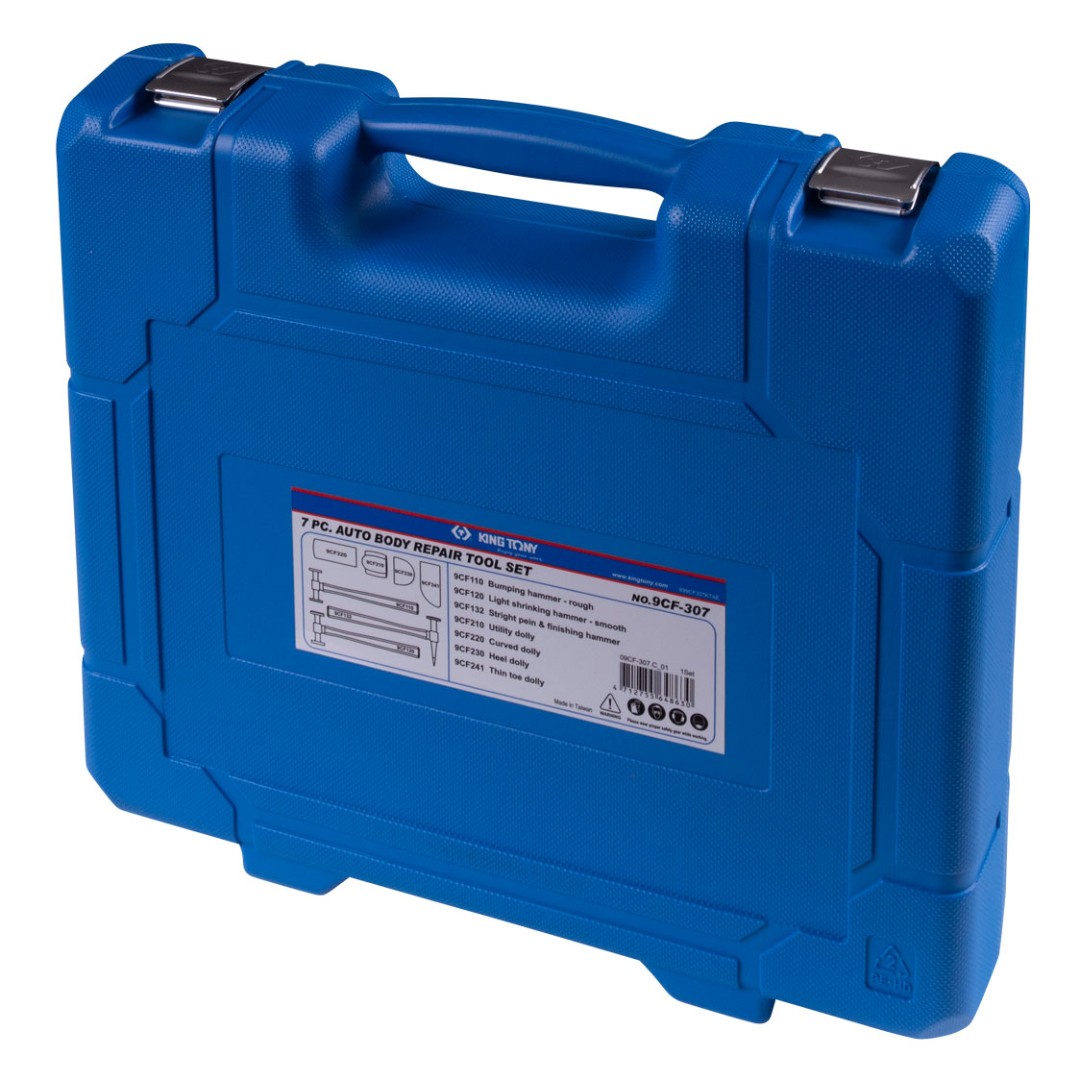 Набор рихтовочных молотков и поддержек, KING TONY 9CF-307 - это специализированный комплект инструментов и приспособлений для выполнения кузовного ремонта автомобилей. Позволяет легко и быстро справиться со вмятинами на железе и придать детали необходимую форму.