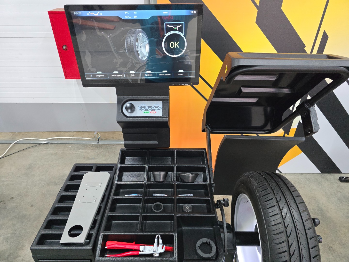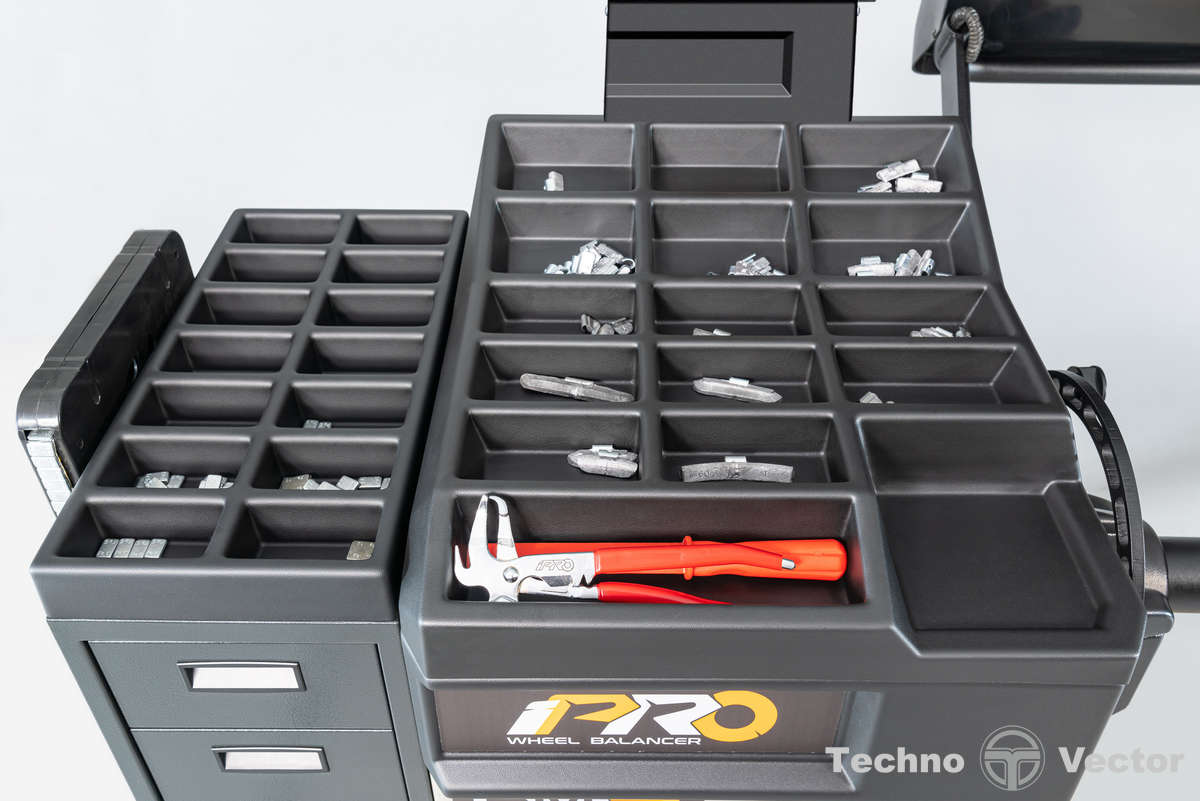 - Основная рабочая поверхность содержит более 29 универсальных ячеек для хранения балансировочных грузов и приспособлений.