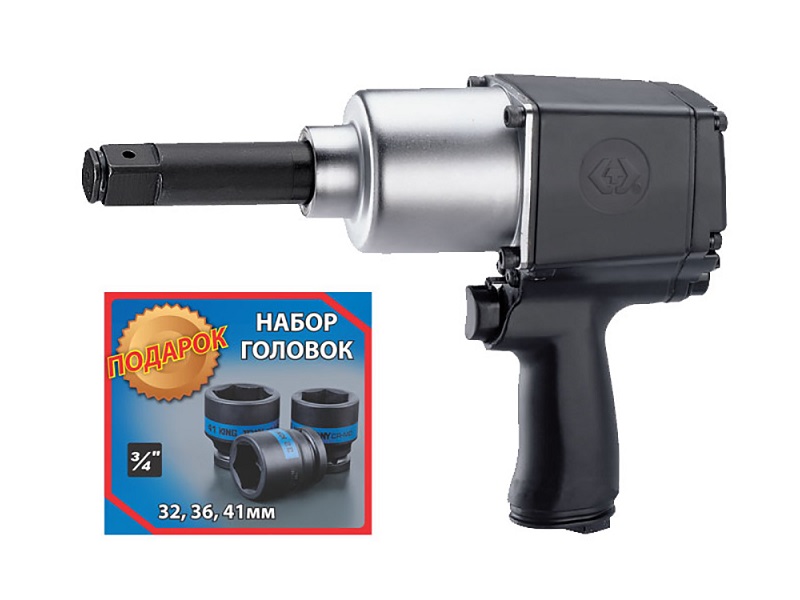 Гайковерт пневматический ударный 3/4", 1085 Нм, удлиненный, в комплекте 3 торцевые головки KING TONY P33622-075B