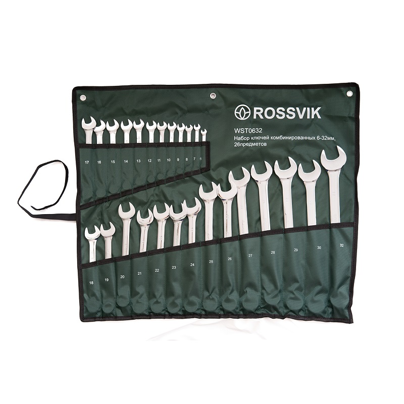 Набор ключей комбинированных ROSSVIK 6-32мм, 26шт. WST0632 один из самых распространенных типов инструмента, гаечный ключ представляет собой конструкцию, объединяющую две части -рожковую и накидную. Инструмент производится из стали высокой прочности. Покрытие ключа устойчиво к царапинам и прочим механическим воздействиям. Используется на станциях технического обслуживания, автомобильных мастерских, промышленности и в быту. Поставляется в удобном прочном чехле, где каждый ключ располагается в отдельном кармане, что позволяет удобно хранить и транспортировать набор.