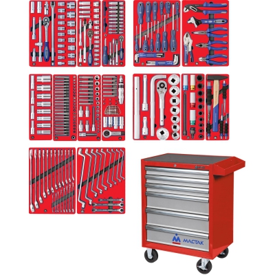 Набор инструментов торговой марки МАСТАК состоит из 299-и предметов, и включает в себя 14 ложементов. Предназначен для организации рабочего места в любом производственном помещении, станции технического обслуживания или авторемонтной мастерской. Набор размещается в тележке МАСТАК 521-06581R.