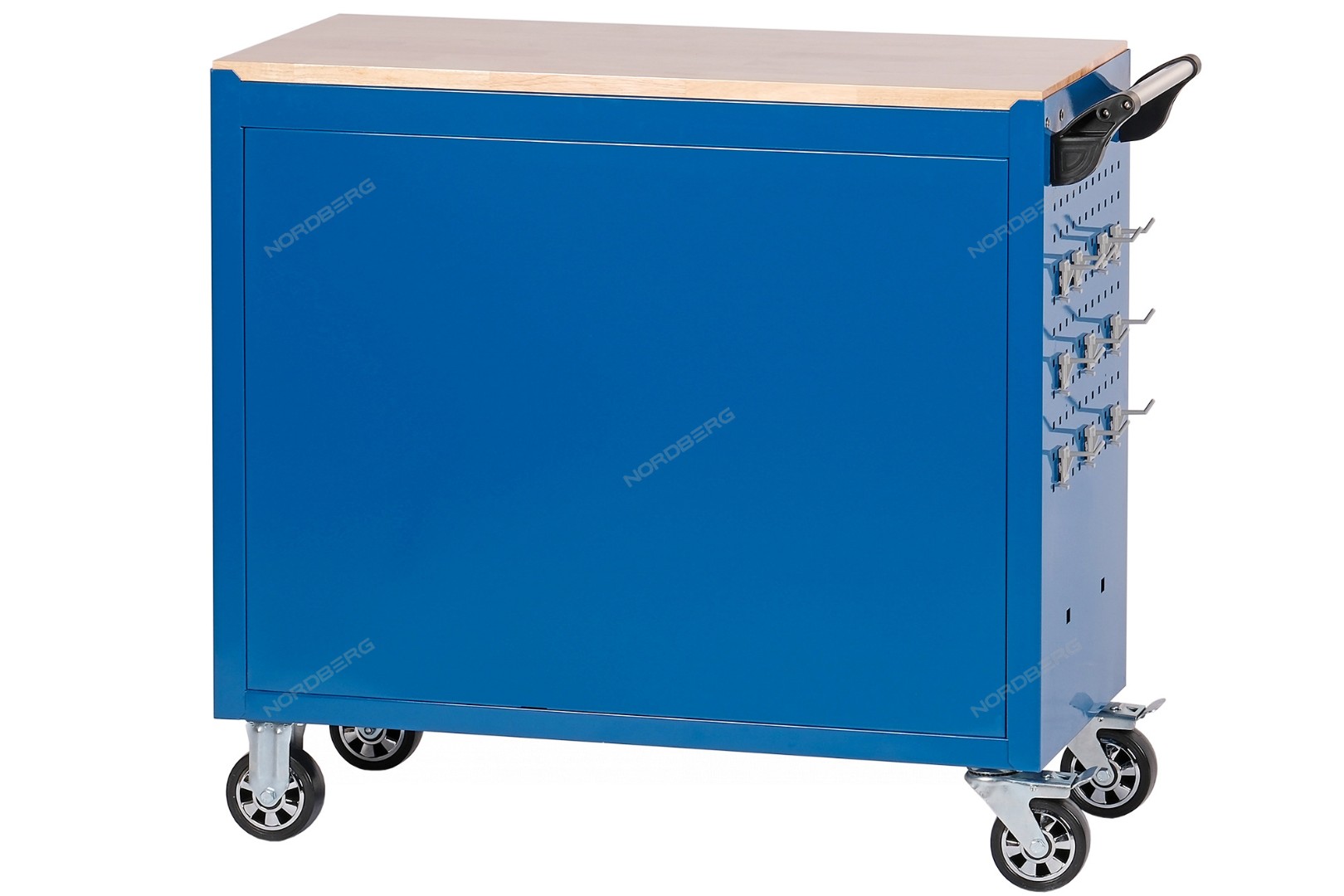 - Пегборд на боковых панелях тележки, оборудованный 10 съёмными кронштейнами с крючками, имеющими двухточечную систему крепления к панели
