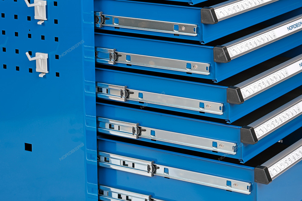 Двойная стенка корпуса, пегборд с двухточечными крючками и выдвижные ящики с плавной системой выдвигания, позволяют одновременно обеспечить надежность и долговечность конструкции, а также максимальную эффективность в хранении инструмента и материалов.
