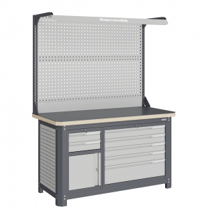 Экран (перфорированная панель) верстака выполнен с квадратной перфорацией 12х12 мм с шагом 38 мм для установки крючков, держателей и других аксессуаров. Экран крепятся к столешнице с помощью специальных кронштейнов. Максимальная масса груза, равномерно распределенного по поверхности экрана, составляет 71 кг.