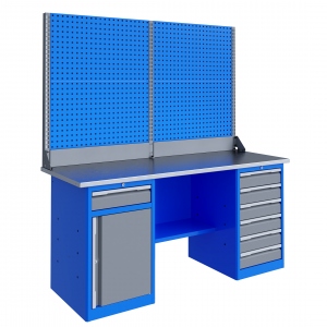 Верстак представляет собой сборно-разборную конструкцию. Верстак комплектуется полкой-стенкой, расположенной под столешницей для удобного размещения габаритного инструмента и оснастки. Все металлические элементы покрыты полиэфирной порошковой краской, обеспечивающей хорошую износостойкость покрытия и невосприимчивость его к моющим средствам и смазочным веществам. Цвет и текстура покрытия корпуса тумб, опор, полки-стенки, экранов и комплектов освещения RAL 5015, гладкая, полуматовая. Цвет и текстура покрытия ящиков и дверок верстака, кронштейнов экранов и косынок RAL 7037, гладкая, глянцевая. Цвет и текстура покрытия накладок ручек ящиков и дверок RAL 9006, гладкая, глянцевая. Столешница состоит из листа влагостойкой фанеры марки ФСФ толщиной 24 мм, которая покрыта лаком-антисептиком и листом оцинкованной холоднокатаной стали толщиной 1,2 мм. Глубина столешниц 696 мм. Максимальная масса груза, равномерно распределенного по столешнице - 1000 кг. Тумбы верстаков выполнены сварными. Ящики в тумбах устанавливаются на шариковых телескопических направляющих полного выдвижения. В тумбе P6 установлено шесть малых ящиков. Внутренние размеры малых ящиков (ВхШхГ), не более: 103 х 397 х 520 мм. Тумбы с ящиками снабжены общим центральным замком с поворотом ригеля 180 градусов и подпружиненной тягой. В тумбе P8 установлен малый ящик и имеется отделение с дверью и одной полкой. Ящик снабжен центральным замком с поворотом ригеля 180 градусов и подпружиненной тягой. Полка устанавливается на парах специальных формованных зацепов, выполненных в боковых стенках тумбы. Имеется возможность смены стороны открывания двери. Дверь тумбы снабжена центральным замком с поворотом ригеля 180 градусов. В комплекте имеется два ключа с каждым замком. Максимально допустимая масса груза, равномерно распределенного по поверхности любого выдвижного ящика 30 кг (при установке в большой ящик двух пар направляющих 50 кг). Максимальная масса груза, распределенного по поверхности полки и полки стенки - 30 кг. Верстак имеет декларацию соответствия ТР ТС 025/2012 «О безопасности мебельной продукции». Верстак имеет сертификат соответствия ГОСТ Р 58863-2020 «Столы производственные. Верстаки из металла. Общие технические условия». Двойной экран (перфорированные панели) верстака выполнен с квадратной перфорацией 12х12 мм с шагом 38 мм для установки крючков, держателей и других аксессуаров. Экран крепится к столешнице с помощью специальных кронштейнов. Максимальная масса груза, равномерно распределенного по поверхности экрана - 21 кг.